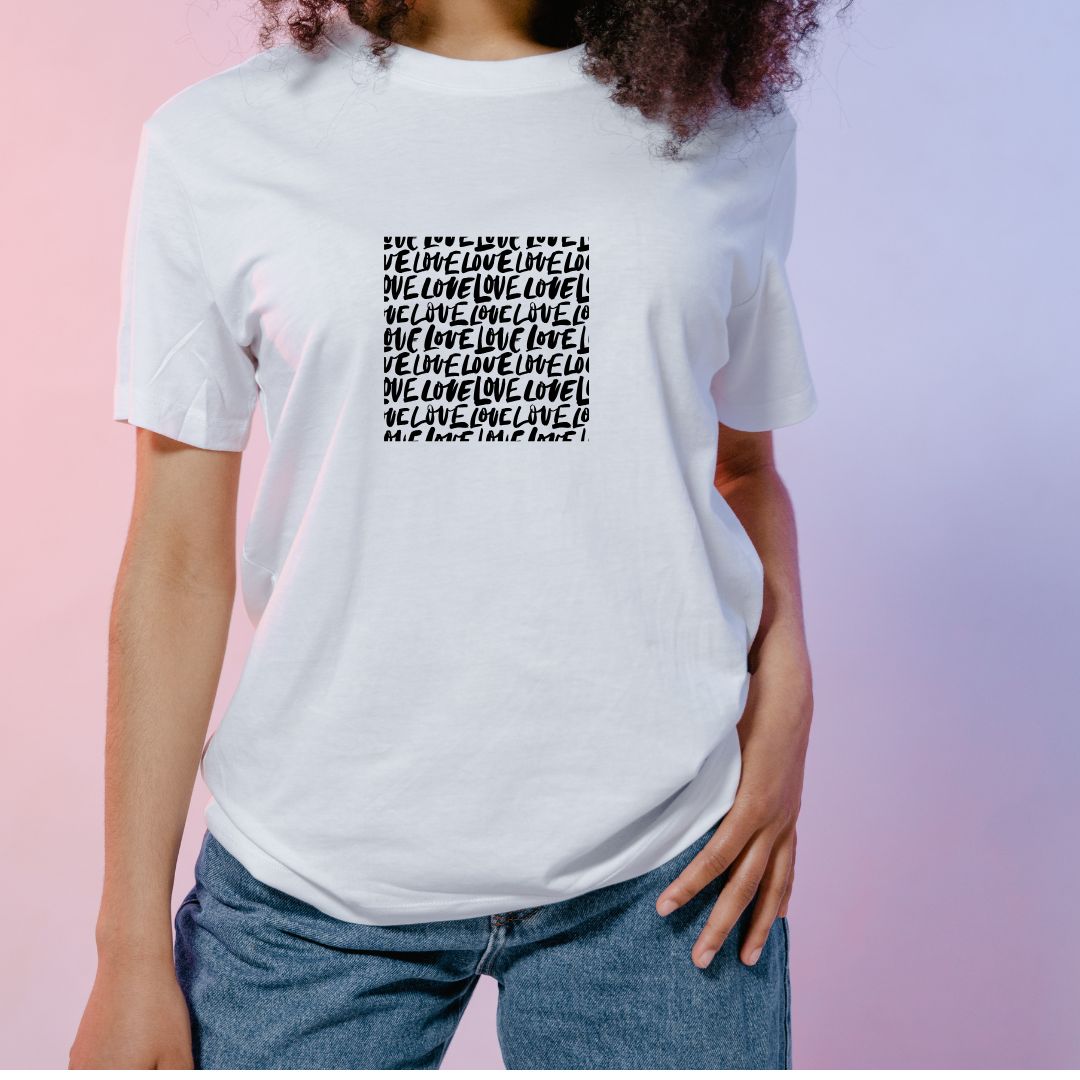 Типография: Централната графика се състои от думата „LOVE“, изписана многократно в плътен, ръкописен шрифт, наподобяващ стила на уличното изкуство (графити) или маркери.